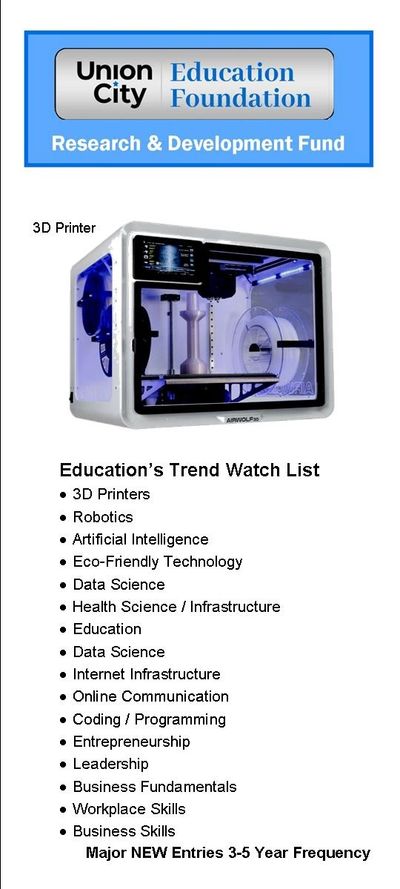 Facing that exact challenge, in 2019 Union City schools initiated a modest ($10,000) introduction proposal for 3D printing to be tested at three grade levels. Unrestricted funds could not be found, delaying for at least 18 months the launch of a process that will allow our students to learn about technology that is predicted to deliver millions of jobs.